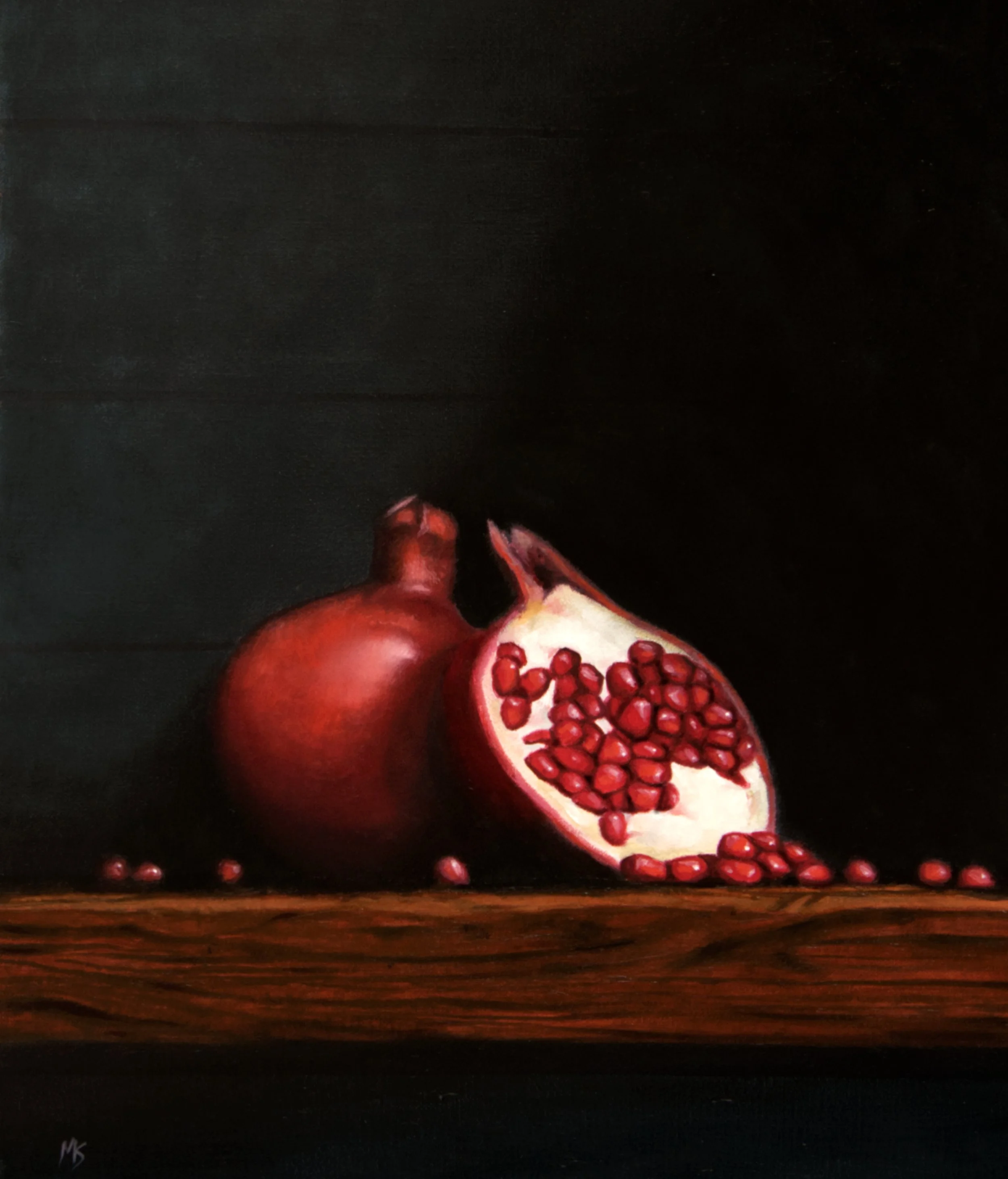 Vibrant red pomegranates and glinting seeds bring this oil painting to life.
