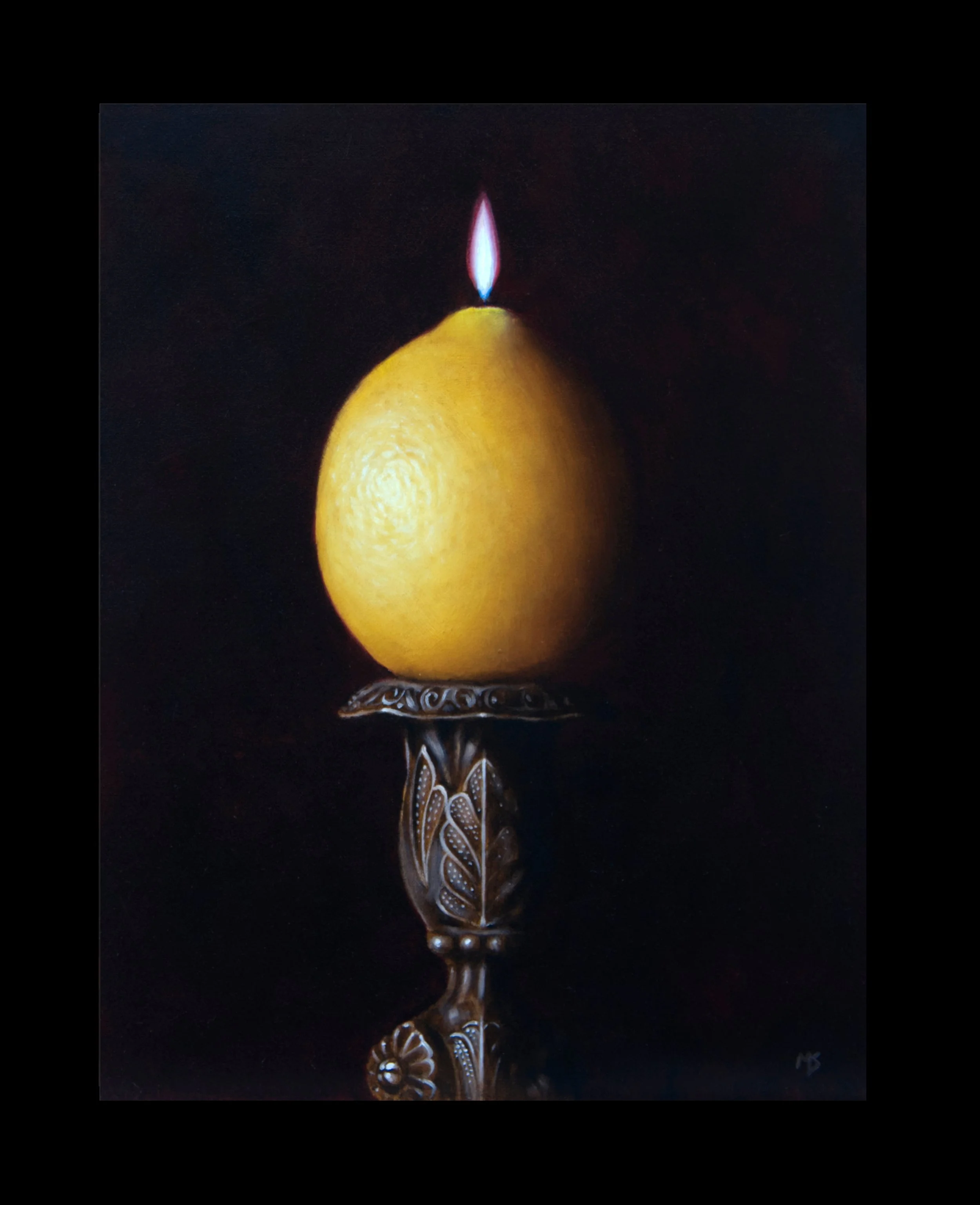 The idea behind this painting was using a real lemon for the scented candle. The candlestick came from a local second hand shop where I spend regular hours sifting through objects for inspiration. The owner’s eyes light up when I go in.